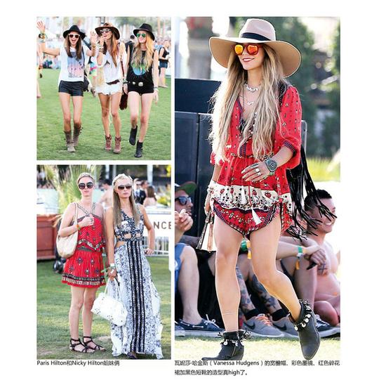 再來說說各路神仙般的明星、IT Girl們,關(guān)于時(shí)裝盛會(huì),她們都愛扎堆兒。走高貴優(yōu)雅女神范兒的,要看奧斯卡紅毯;走新潮尖端凹造型的,要看時(shí)裝周街拍;而想要活潑混搭接地氣的,那就 必須來看音樂節(jié)。愛穿長裙戴花冠的帕麗斯-希爾頓(Paris Hilton),愛露小腰的卓丹-鄧(Jourdan Dunn),愛運(yùn)動(dòng)風(fēng)造型的卡德拉姐妹(Khadra Twins),愛牛仔的時(shí)尚博主嘉拉-法拉格尼(Chiara Ferragni)……總之在音樂節(jié)不甘示弱的時(shí)尚舞臺上,雖說碎花單品加熱褲是絕對標(biāo)配,寬檐帽、爵士帽加上太陽鏡也是萬年錯(cuò)不了的必然裝備,但流蘇 包、雨靴什么的,還有民族派、復(fù)古風(fēng)、臟搖滾或是小摩登,也都有各自閃亮的一席之地,其實(shí)你怎么混著來都可以。凱特-莫斯(Kate Moss)姐當(dāng)年還專愛在格拉斯頓伯里音樂節(jié)(Glastonbury Festival)穿皮靴哩。